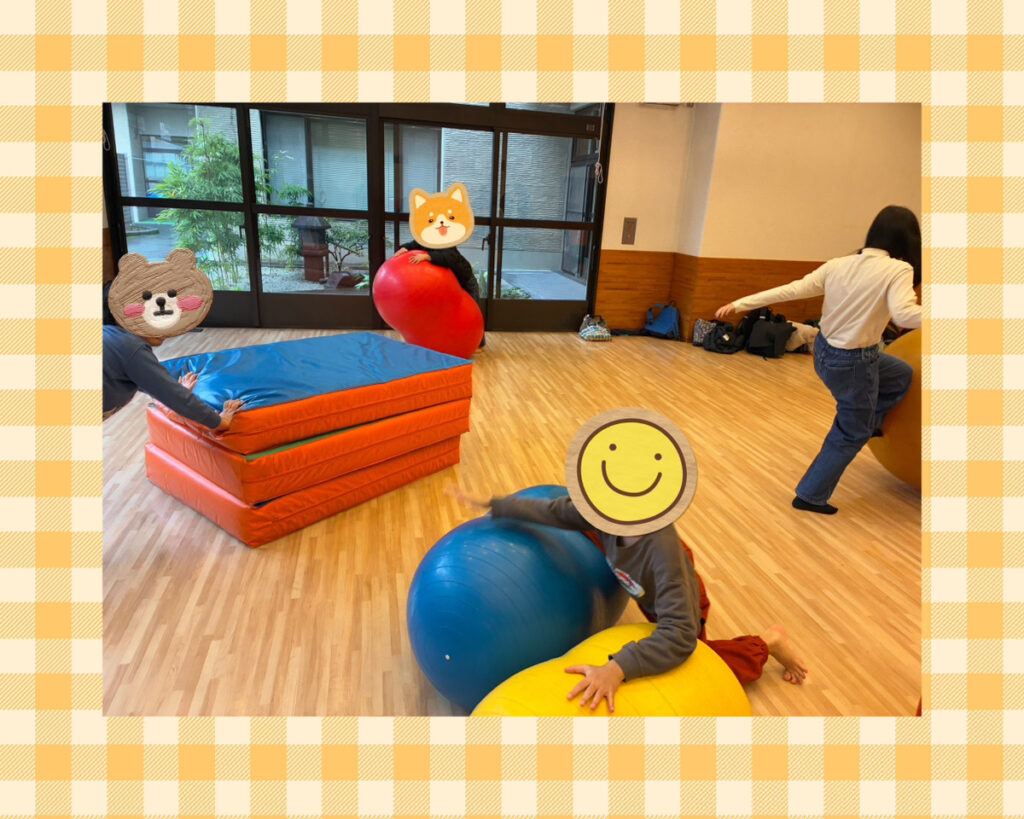 高野スポーツセンターの体育館をお借りした際の一幕です。バランスボールやクッション性のアトラクションなど、ケガのリスクが低い遊具が豊富にあり、小さな子から高学年の子まで様々な楽しみ方を発見して遊んでくれていました(*’ω’*)